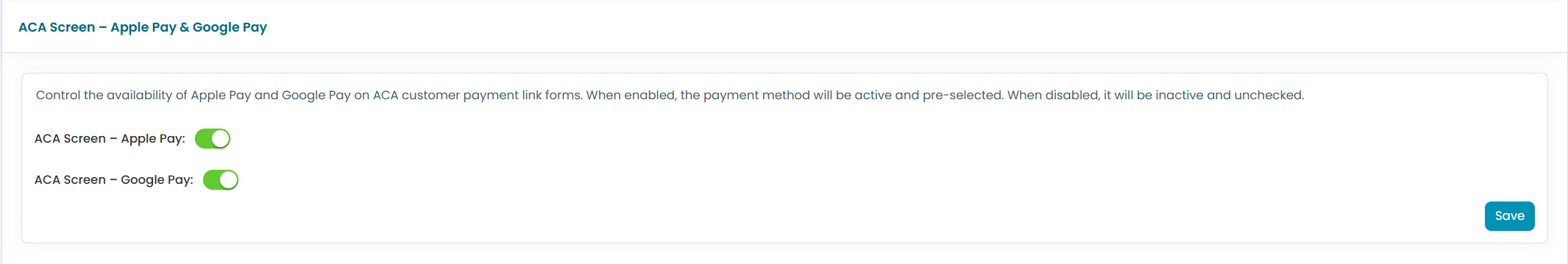 When each slider is set to the On (Green) position tick boxes asking if Apple and Google pay should be allowed will be ticked by default.