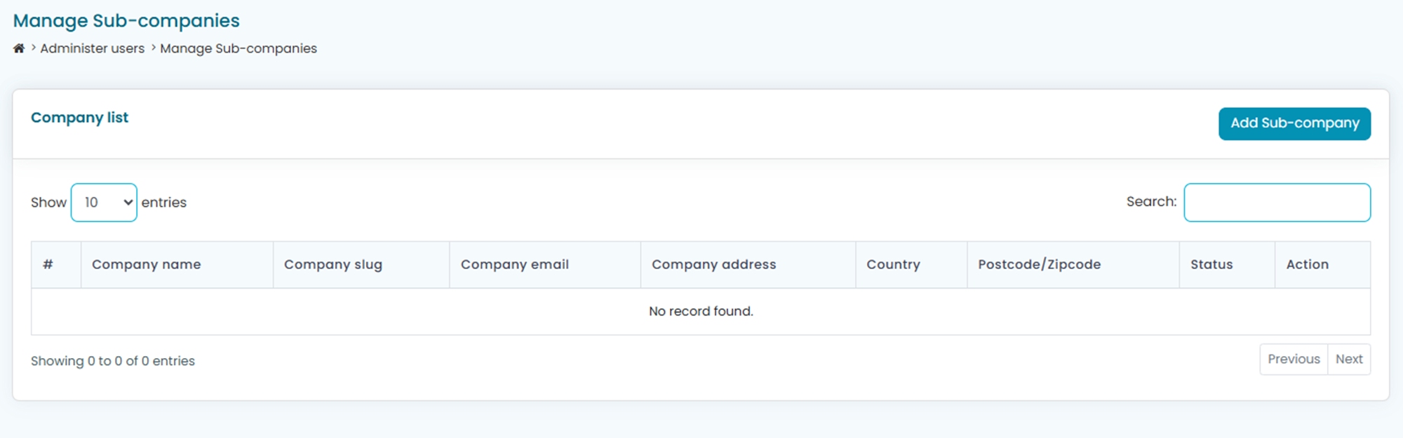 Once activated a new Sub-menu option 'Manage Sub-companies' will appear under the Administer users menu.