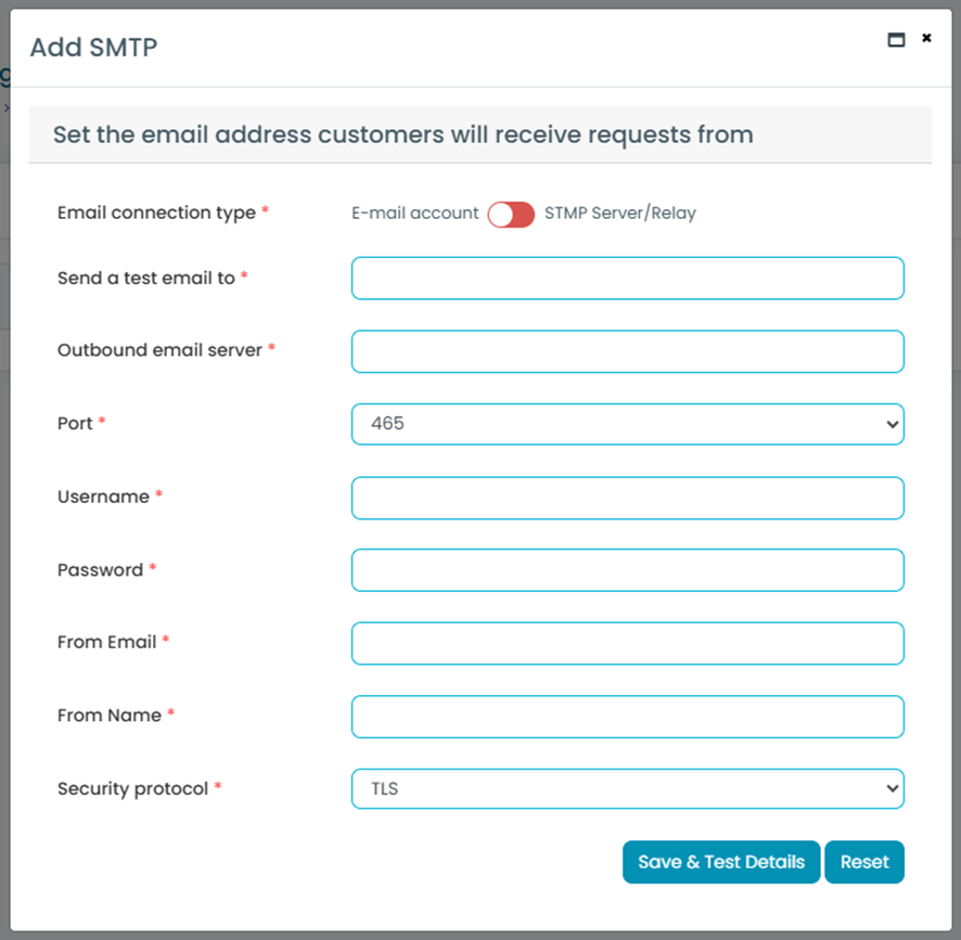 SMTP is outbound email. Once activated Paytia will send all outbound electronic email correspondence through this email service. This allows you to force emails to appear send from your own company email services.