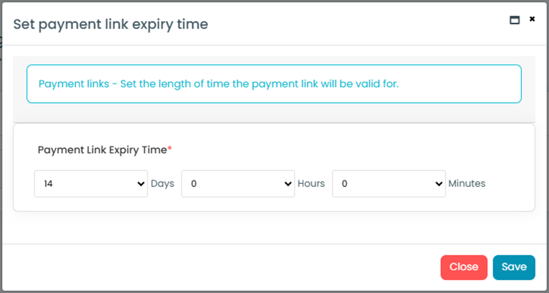 Payment link expiry time allows a timeout to be applied to payment links created and sent to customers. Once expired, Payment links are not longer usable.